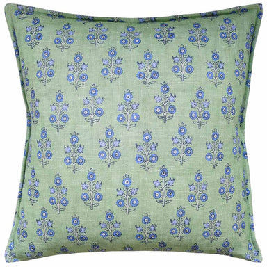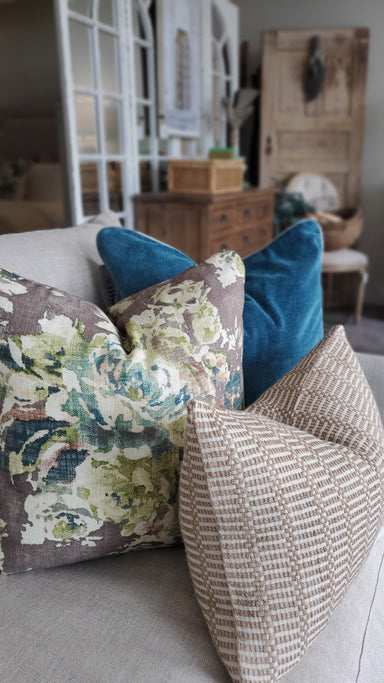 $225| /Our 20x20 custom linen pillow is a show-stopper with its unique mix of color and floral pattern. We love its mushroom base, mix of greens (from sag...