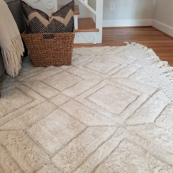 from $80Hand Woven of Wool, Jute, Cotton. This gorgeous patterned rug is reversible and has a mix of sage green, soft blue, white, off-white, and charcoal....